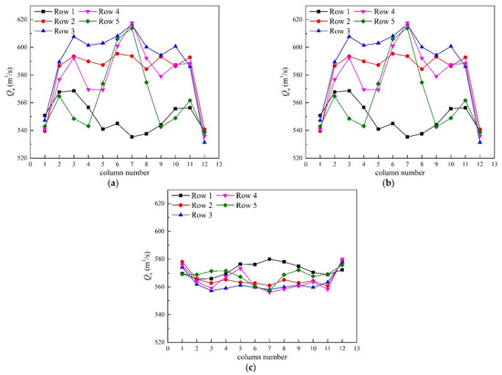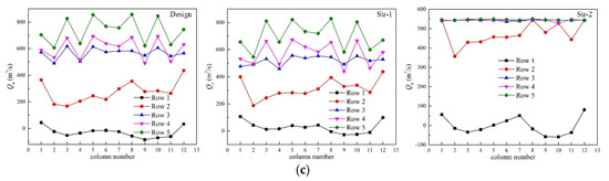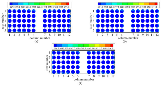 In the absence of wind, the temperature and flow fields of Str-1 case were the same as the design condition because the fans operated at the rated speed. Figure 5 gives the distributions of air temperature at fan inlet for the cases of Design, Str-1, and Str-2 under windless condition. It can be seen from Figure 5a that the temperatures of inlet air under the design condition were basically the same as the environment temperature. For Str-2 case, the inlet air temperatures hardly changed compared with the Design case, as shown in Figure 5c. However, the air volumetric flow rates of fans for Design case and Str-1, as shown in Figure 6a,b, were uneven due to the fan-group effect, even if the fan speeds were the same. The volume flow rates of the fans in Column 1, Column 12, and Row 1 were much smaller than other fans. As displayed in Figure 6c, the volumetric flow rates were relatively uniform for the Str-2 case by adjusting the fan speed.