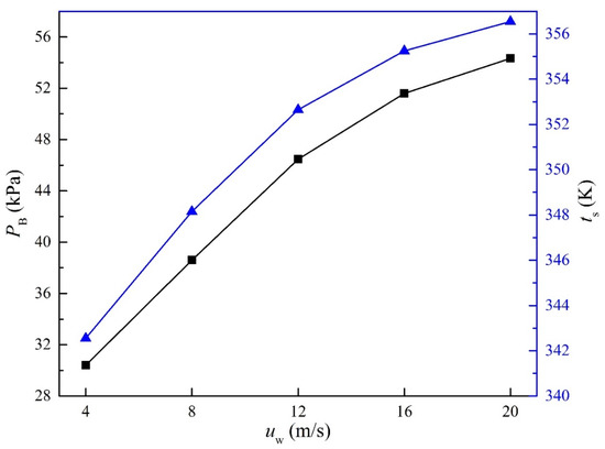 Under the wind conditions, the back pressure of turbine pB increased from 30.40 kPa to 54.33 kPa at the wind speed range of 4 m/s to 20 m/s, as shown in Figure 7. At wind speeds lower than 12 m/s, the change in pB with wind speed was basically linear, and the growth of pB slowed at larger wind speeds. The changing trend of the temperature of exhaust steam ts was basically the same as that of pB.