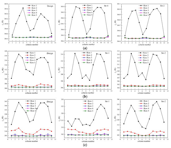 The performance degradation of ACCs under the action of wind was mainly due to changes in the cooling air entering the fans. The inlet air temperatures of each fan for the Design, Str-1, and Str-2 cases are demonstrated in Figure 8. It is evident that the inlet temperatures in Row 1 were much higher than others, which was more obvious under high wind speeds. Moreover, the highest value appeared in the central area of Row 1 of each ACC. The methods of Str-1 and Str-2 could reduce the air temperature of Row 1 significantly. The temperature difference of the other rows for different operating models was not obvious. This shows that the high fan speed of Row 1 was beneficial to reduce the inlet air temperature. At the wind speed of 4 m/s, the inlet air temperatures of leeward fans were basically the same as the ambient temperature, as shown in Figure 8a. However, as the wind speed increased, the rises in inlet temperatures of the leeward fans became more and more significant, as shown in Figure 8b,c. The inlet air temperatures of fans in Row 2 reached 306 K and 314 K at wind speeds of 12 m/s and 20 m/s, respectively, which are much higher than the ambient temperature. In addition, the air temperatures of leeward fans in the two proposed operating strategies also decreased.