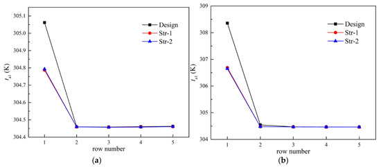Figure 9 displays the average inlet air temperatures of each row. Obviously, the average inlet air temperatures of leeward fans for Str-1 and Str-2 cases were almost the same at various wind speeds. Moreover, the average temperatures of Row 1 showed no difference and were much lower than the design conditions at wind speeds lower than 12 m/s. The temperatures of Row 1 for Str-1 cases were lowest at high wind speeds. Furthermore, the temperature difference between the leeward fans for Str-1 and Str-2 gradually widened compared with the design condition with increasing wind speed.