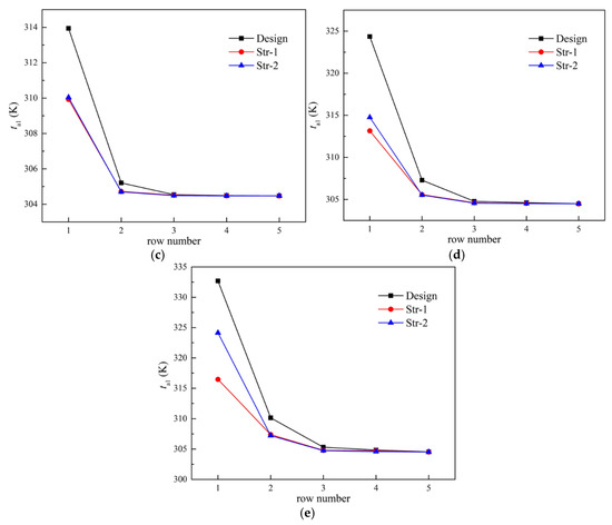 Average inlet air temperatures of fans in each row for Design, Str-1, and Str-2 cases at different wind speeds: (a) 4 m/s; (b) 8 m/s; (c) 12 m/s; (d) 16 m/s; (e) 20 m/s.