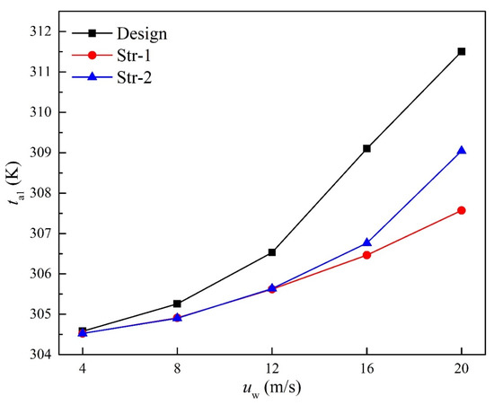 The average inlet temperatures of cooling air at different wind speeds are given in Figure 10. A greater value of the ambient wind speed led to a faster increase in the average temperature, and the temperatures for Design cases were much higher than those for Str-1 and Str-2 cases at high wind speed. The average temperatures for Str-1 and Str-2 were almost the same when the wind speed was smaller than 12 m/s, as also illustrated in Figure 9. The average temperatures for Str-1 grew more slowly than other operating methods at high wind speeds. The biggest temperature difference between Design and Str-1 cases reached 3.93 K when the wind speed was 20 m/s.