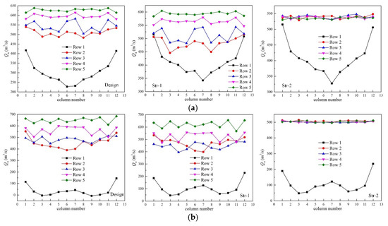 - The distribution of volumetric flow rates of Str-1 and Str-2 cases was more even, especially for Str-2 cases. The total volumetric flow rates of Str-2 cases were the smallest under various wind conditions, while the flow rates of Design and Str-1 cases were almost the same.