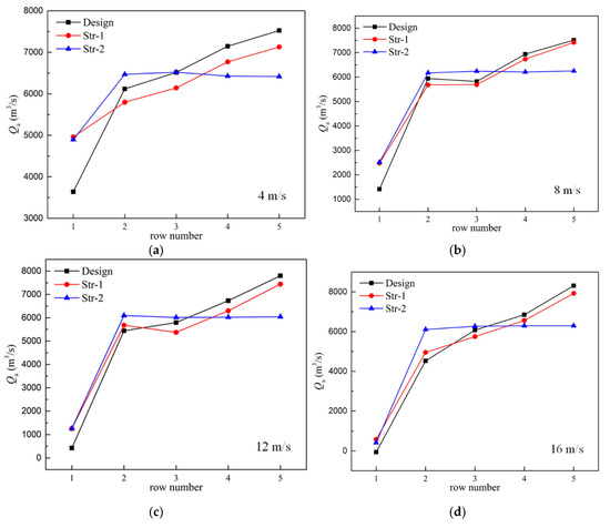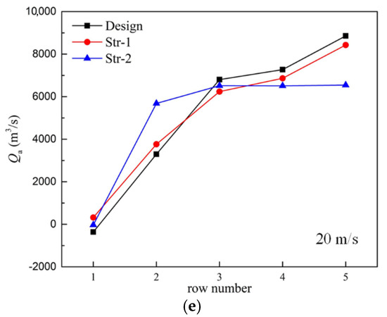 Total volumetric flow rates of fans in each row for Design, Str-1, and Str-2 cases at various wind speeds: (a) 4 m/s; (b) 8 m/s; (c) 12 m/s; (d) 16 m/s; (e) 20 m/s.