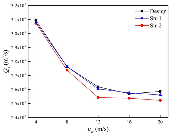Figure 12 shows the total air volumetric flow rates of each row at different wind speeds. In general, the high speed of upwind fans in Row 1 could enhance the volumetric flow rate, but this trend became smaller as the wind speed increased. The volumetric flow rates of leeward fans in each row for Str-2 were very consistent upon adjusting the fan speed. For Str-1, the volumetric flow rates for Row 3 to Row 5 were basically reduced proportionally compared to the design cases. The volumetric flow rates of Row 2 of Str-1 were smaller than the design conditions at low wind speeds, and the situation was just the opposite at high wind speed although the speeds of leeward fans were lower than the rated speed. Figure 13 gives the total volumetric flow rates. The cooling air flow rates required by Design and Str-1 cases were nearly the same, which were both larger than Str-2 cases, proving that Str-2 was most beneficial to the heat transfer of ACCs.