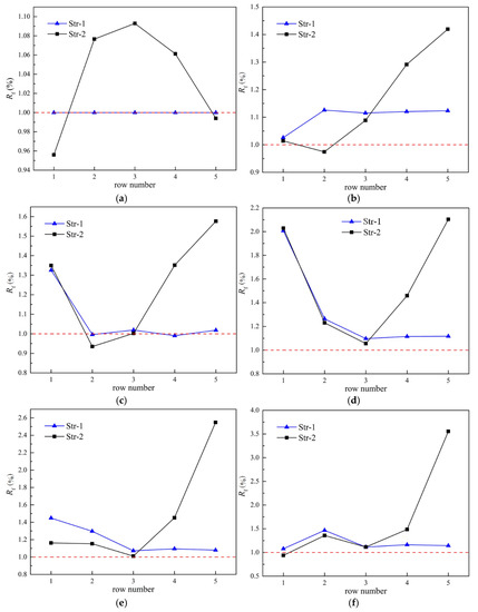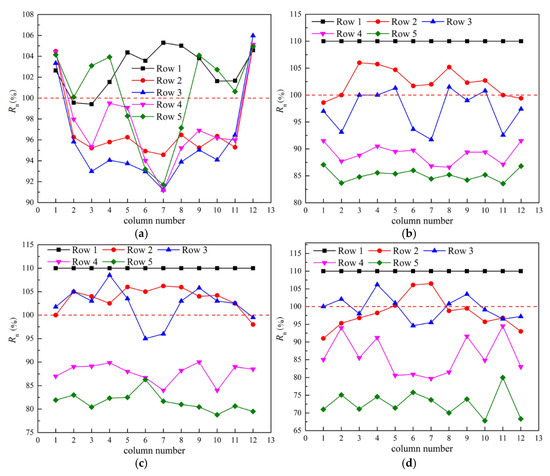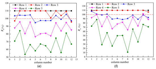 The distribution of rotational speeds of Str-2 is shown in Figure 14. Without wind, as shown in Figure 14a, the speed ratio of all fans in Column 1 and Column 12, as well as some fans in Row 1 and Row 5, exceeded 100. The speeds of other fans were lower than the rated speed. Under windy conditions, the speed ratios of the fans in Row 1 reached the maximum value of 110 and almost all increased to 110 in Row 2 when the wind speed reached 20 m/s. The fan speeds of Row 3 were basically around the rated speed. The speed of the fans in the last two rows was basically lower than the rated speed. In addition, the fluctuation range of the rotational speeds of the fans in the last two rows became larger with the increased wind speed. Except for the second and third rows, the speed of the fan along the wind direction was reduced.