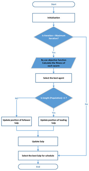 As shown in Figure 5, the salp swarm home devices planning mechanism is suggested in the work to optimally design home appliances. The action of the salp swarm algorithms is based on the navigation and foraging of the salp swarm in oceans. The key explanation for this optimization technique is its swarming activity in which all salps move and drill food together [44].