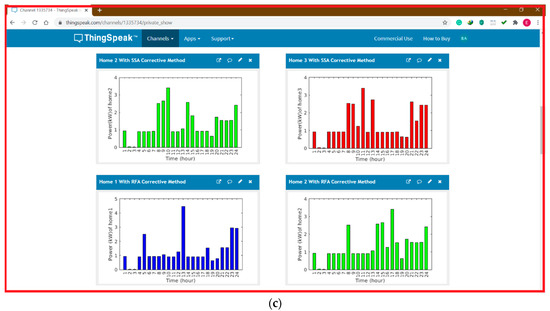 In this simulation test, the outcomes of smart EMS applied with the proposed method over a cloud-platform to control devices in the microgrid are introduced and discussed. In this paper the MATLAB is a chief command and control unit organizing a ThingSpeak platform, developed in a software communication and architecture interface. MQTT functions as a broker between subscribing microgrid devices and main control unit. In this paper, the ThingSpeak platform interface that has been designed is a simple and convenient Graphical User Interface (GUI) that allows a house owner to interact and access with their home energy management as a service over the cloud system. Figure 7a shows the ThingSpeak web page to the enter user name and password of the customer, Figure 7b,c shows the ThingSpeak dash-board illustrate the results of the proposed system