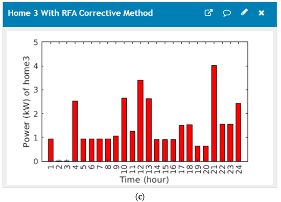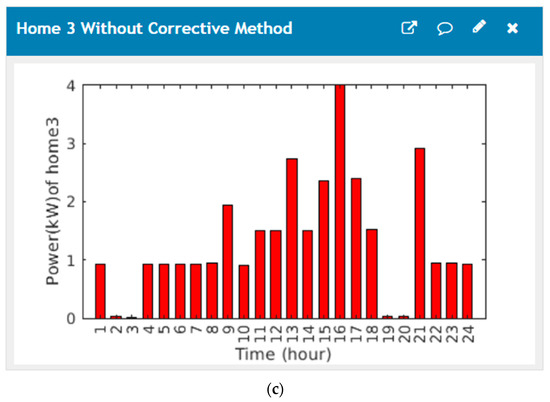 Power GUI of the suggested home structure without corrective method: (a) load profiles of the first house; (b) load profiles of the second house; (c) load profiles of the third house.