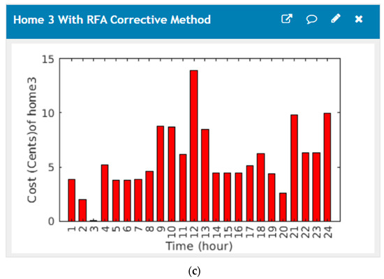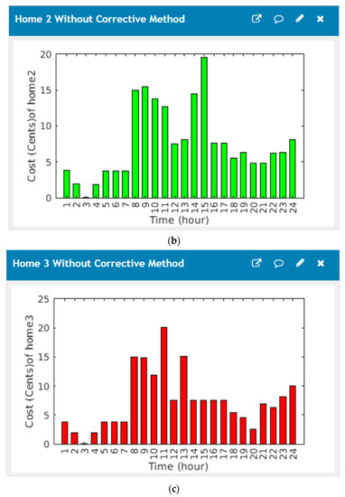 The home energy management system comprises a GUI and related software to facilitate users power consumption and total cost of the microgrid devices; their power consumption of all homes without the corrective method is implemented as displayed in Figure 8. Figure 9 shows the cost graphical user interface of proposed home energy management system without the corrective method, (a) cost profiles of the first house, (b) cost profiles of the second house, (c) cost profiles of the third house.