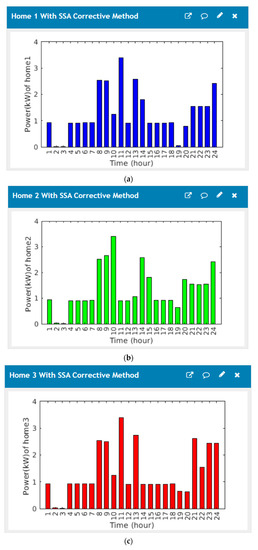 Power GUI of the proposed system after implementing the SSA algorithm: (a) load profiles of first house; (b) load profiles of second house; (c) load profiles of third house.