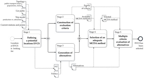 The 5MAGISEV methodology is composed of five key stages: Stage 1, defining potential locations of EVCSs; Stage 2, construction of the family of evaluation criteria; Stage 3, generation of alternatives; Stage 4, selection of the multiple criteria decision aiding method; and Stage 5, multiple criteria evaluation of alternatives. The final result of such a methodology is a suggested electric vehicle charging infrastructure in the considered territory defined as a compromise accounting for all of the criteria.
