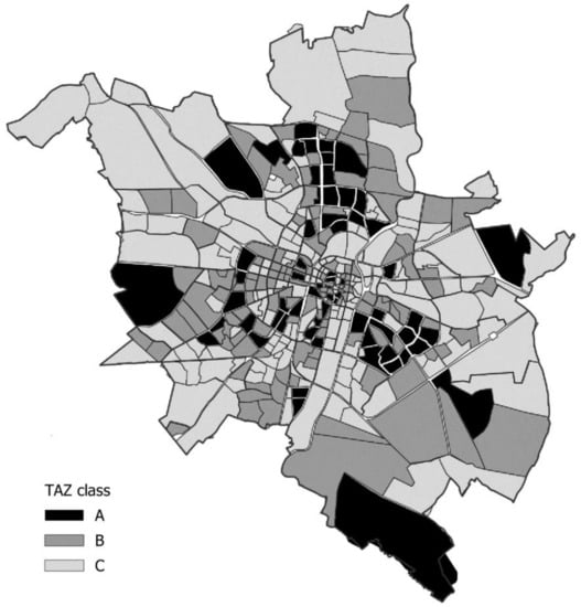 The potential EVCS locations were also classified in another aspect, i.e., according to the traffic analysis zone (TAZ) class used in the transportation model of the Poznan Metropolitan Area. Three classes of TAZs were determined based on the sum of traffic production and attraction for the area (see Figure 2). The 64 TAZs with the highest values of production and attraction (40% of the total for the city of Poznan) were categorized as Class A. Another 133 TAZs were categorized as Class B. These areas accounted for a further 40% of the traffic production and attraction in Poznan. The remaining 187 TAZs were assigned to Class C. These areas were characterized by the lowest values of traffic production and attraction (totaling 20%). Table 3 shows the number of car parks classified in each group, and Figure 3 shows their geographical distribution in Poznan. The areas where no EVCSs were located are airports, lakes or green areas.