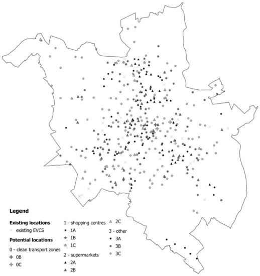 Formally, the potential locations of EVCSs are described by Dividing car parks into groups allows prioritizing different types of areas and POIs by specifying how many potential locations from each group should be included in the alternatives generated during Stage 3 of the methodology. The location of EVCSs in clean transport zones supports the city’s policy of promoting e-mobility. These are also the locations that favor the use of e-cars. The choice of shopping centers and supermarkets as relevant POIs is based on the fact that shopping can take sufficient time to make charging the vehicle possible. These entities may also be interested in locating publicly accessible EVCSs to increase the attractiveness of their facilities. Car parks assigned to these groups should be located in or adjacent to the designated areas/POIs, i.e., within a comfortable walking distance.