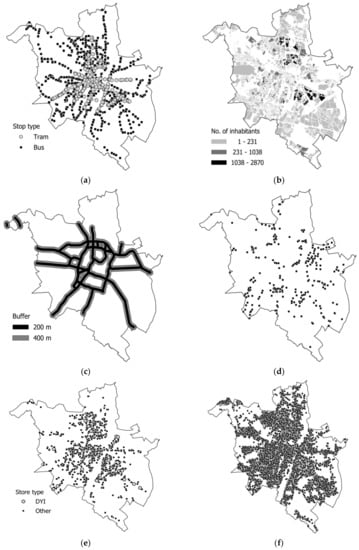 The maximum distances to supermarkets and shopping centers were selected so as to ensure a comfortable walking distance to shoppers’ cars; i.e., they were shorter or close to the average distances of pedestrian shopping trips indicated in the literature (see, e.g., [56,84,85,86]).