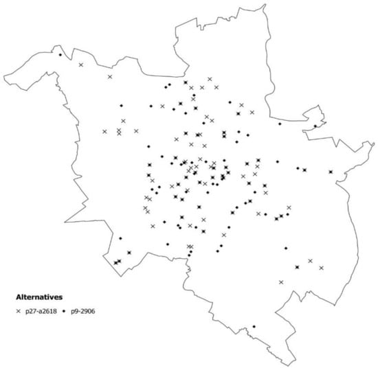 At this stage, a set of alternative criteria , being a particular configuration of EVCSs at the considered area, is generated according to one or more policies. Each of the policies differs in the number of i locations allocated to each parking group and TAZ listed during Stage 1. Alternatives are obtained by randomizing these locations from all available potential locations in a given parking group. Policies may reflect the concept of fairness preferred by public decision-makers (e.g., in terms of EVCS distribution between city districts) or vision of development in the case of commercial enterprises and current or negotiated agreements with other entities. The considered set may also include additional policies, such as those proposed during consultations by stakeholders or developed by experts. In the latter case, the policies may enable the decision-maker to understand the effects of different assumptions better.