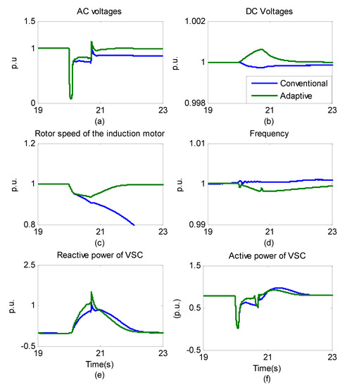 In [12], a control system is developed to provide reactive power support under short-circuit faults of the AC network. The reactive current limit can be changed depending on operation modes. This control scheme employs three different operation modes depending on conditions of the AC system, namely conditions of steady state, infeed grid fault, sending end grid fault, and conditions of sending end grid fault which is not cleared in time. However, the reactive current limit in this control scheme is not automatically changed according to real conditions of the system. Decisions of grid operators are still required. In an operation mode for maximum reactive power, the control scheme will default to using the total capacity of VSC for reactive generation without taking care of the realistic frequency of the system. This can lead to the frequency worsening because of a shortage of active power. Additionally, this control system also requires a communication system receiving an external control signal. The case study of [12] is based on the transmission network of Denmark with only one VSC-HVDC link, and it is restricted to the realistic grid.