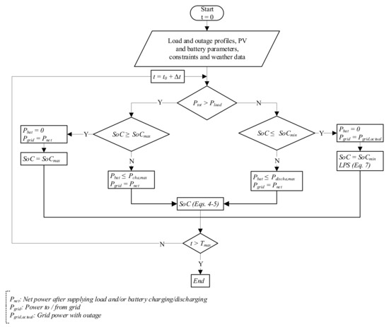 where Ptot is the total available power from the grid and PV, Pload is the load demand, ηinv and ηbat are the inverter and battery efficiencies, assuming a discharge efficiency of 1, Cbat (kWh) is the battery storage nominal capacity, and Δt is the simulation time-step increment, which is 1 min in this study. Here, note that the total power during outages is only the PV power, as the grid power is zero.