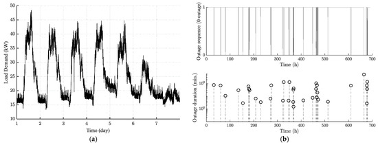 Load demand and outage profiles measured data: (a) representative one-week (12–18 November 2018) load demand—the first five days represent the weekdays’ load and the last two days for weekends; and (b) outage sequence (upper) and corresponding outage durations (lower) during the measurement period—24 October to 21 November 2018.