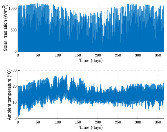 The PV power output directly depends on the global solar irradiation incident on the PV panel surface and the ambient temperature of the location. For the site considered in the case study in Ethiopia at a 9.04° N latitude and 38.8° E longitude, the used solar irradiation resource and ambient temperature data are from [44] and given by Figure 4. The dish-shaped irradiation and the temperature minimums in mid-year, are due to the rainy season in the country.