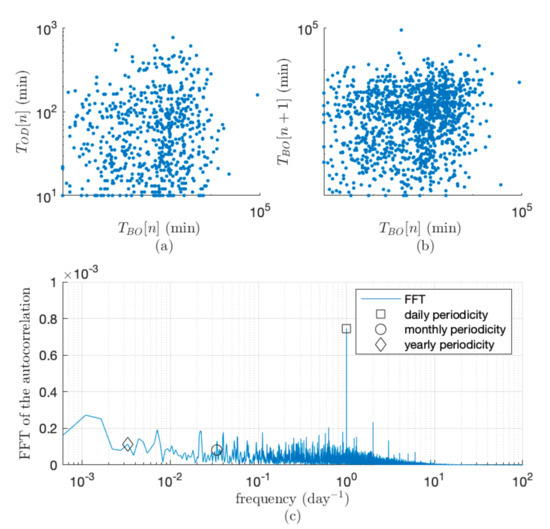 Correlation diagram between (a) outage duration and time between outages, (b) between two consecutive outages, and (c) frequency analysis to highlight the outage periodicities.