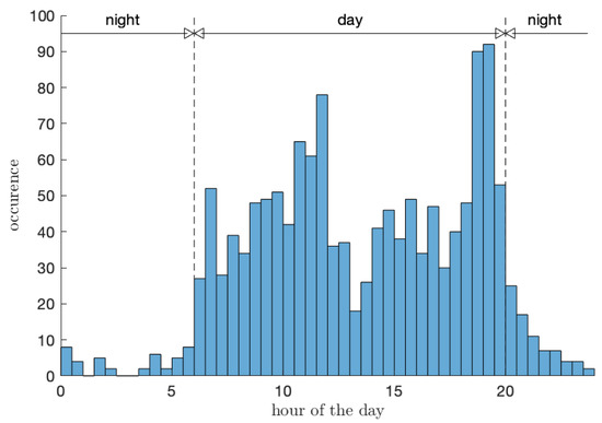 The periodicity check showed that the distribution outage is totally random without any long-term periodicities, concluding that there is no cyclic nature with seasons, nor is there in yearly, monthly, and weekly patterns. In contrast, a clear daily periodicity is visible. Figure 6 shows the time of occurrence of the failures during the day. Most outages occur during the day and seem to be linked to the global load demand. In other words, the probability of outage occurrence is positively correlated to the power requirements of grid users.