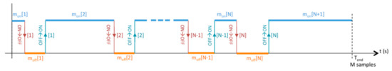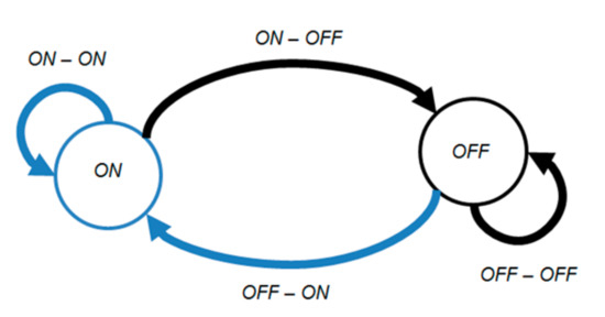 where current states are listed in the column and future states in the lines. An easy way to build the transition matrix is to count the total number of each transition. Suppose a measured historical global data with a series of M samples times, and these two possible states. The MTM with a total number of outages N, a total number of samples in OFF state MOFF and deducing the total number of samples in ON state M-MOFF gives (see Figure 8):
