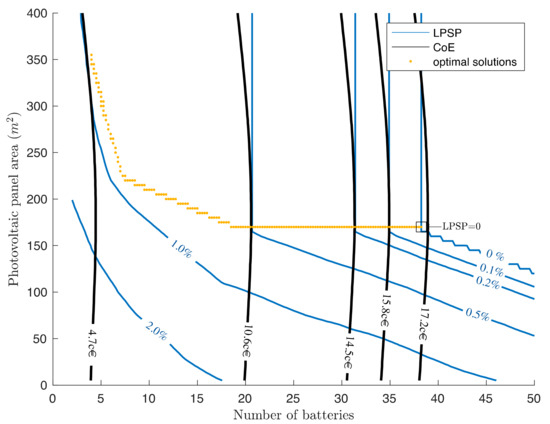 The two-objective function considered is: the minimization of the cost of energy (CoE), which is composed of the system and associated costs, as well as grid-charging cost; and the minimization of the LPSP, which is the measure of the reliability improvement by reducing or fully overcoming the grid outages. The optimization algorithm evaluates the area of PV panels (Apv) and number of batteries (Nbat) to be installed either to avoid outages or for minimization. Hence, the area of the PV panels and the number of storage batteries are the sizing parameters in the optimization: