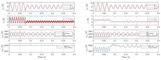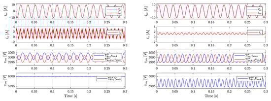 Figure 6. Each figure contains four time-diagrams: (1) AC current reference and response; (2) circulating current; (3) sums of upper and lower arm submodule voltages; (4) total sum of submodule voltages. Simulation results of Classical Control are presented in four time-diagrams on the left, while OSS-MPC simulation results are presented in four time diagrams on the right.