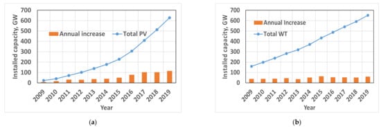 Annual increase and total installed capacity for: (a) photovoltaic; (b) wind generators [].
