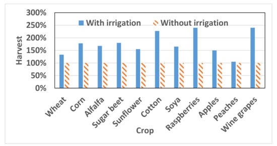 On the other hand, agriculture is an industry sector with a low contribution to the gross domestic product (about a 4% average value on a global basis for the past decade []), but with a very high importance for humanity. According to the Food Agriculture Organization of the United Nations, food production has increased by more than 100% in the last 30 years []. The expected growth until 2050 is a further 60% increase. These expectations raise the necessity to improve agricultural production. The main mechanism for increasing agricultural yields is irrigation. Research [] shows that yields can be significantly increased though improved irrigation for almost all of the studied crops, reaching up to 250% for some of them (Figure 2).