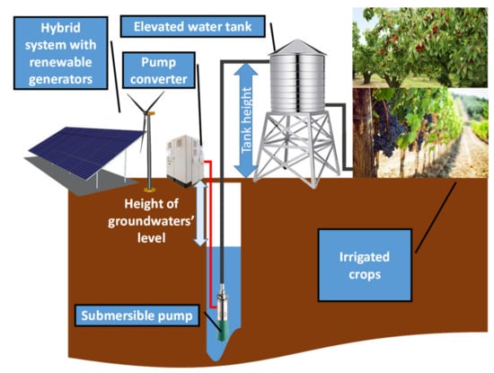 According to [], irrigation is the main agricultural activity with an influence on yields, apart from planting, cultivating and harvesting, in which renewable energies have significant uses. The sun and wind are the renewable energy sources used for water pumping for irrigation by the means of PV generators and wind turbines. This paper considers the application of a hybrid system with tank storage for irrigation purposes.