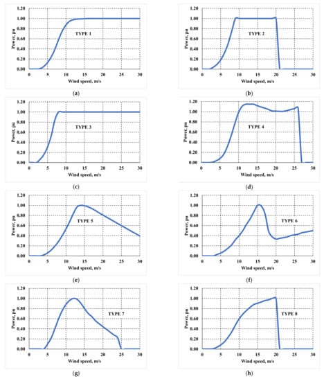 Typical power curves per unit (p.u.), as used in the methodology: (a) Type 1; (b) Type 2; (c) Type 3; (d) Type 4; (e) Type 5; (f) Type 6; (g) Type 7; (h) Type 8.
