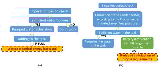 For the systems with batteries, in the case of insufficient water in the tank, an additional verification is performed, i.e., the sufficient state of charge of the battery to pump additional water to meet the irrigation needs. In the case of there being enough energy in the battery, the tank is filled to the needed level. After that, the irrigation is performed and the tank is emptied. At the same time, the battery’s state of charge is reduced.