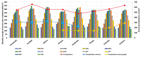 - Evstatiev, B.; Gabrovska-Evstatieva, K.; Trifonov, D.; Mihailov, N. Solar energy potential to power the irrigation of orchards in Bulgaria. In Proceedings of the 47th International Symposium, Actual Tasks on Agricultural Engineering, Opatija, Croatia, 5–7 March 2019; pp. 213–221, ISSN 1848-4425. [Google Scholar]