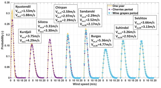 The wind speed is generally measured at a 10 m height in meteorological stations, but the WT hub height is rarely 10 m; as such, it is then necessary to convert it. The wind speed Vh at the hub height h is calculated from the 10 m measured wind speed using the Justus’s Equation [] and the Hellmann exponent αJ.