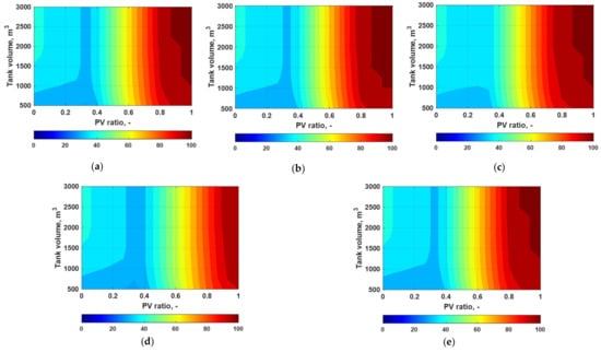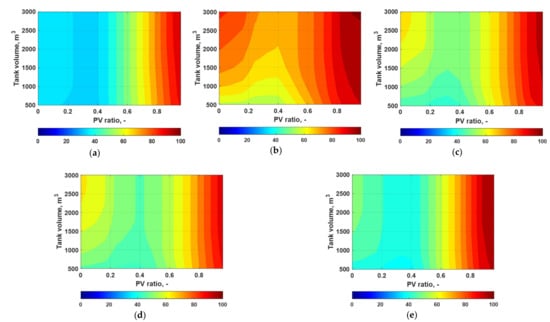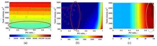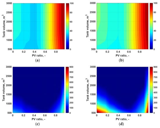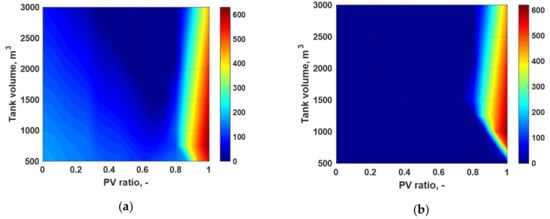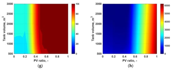 The first optimization parameter considered is the investment cost (IC), which includes the HRES equipment (generators, power converters, wiring and water tank) and its installation. The IC utilization facilitates the study because the operation and maintenance costs require precise information for the inflation rate, which is not always available. The investment cost depends on the water tank’s volume and the rated powers of the generators in the HRES. The costs can vary for the different countries. In the proposed sizing methodology, the costs are sourced from [,] for the PV generators, [] for the WT and [] for the water tank.
