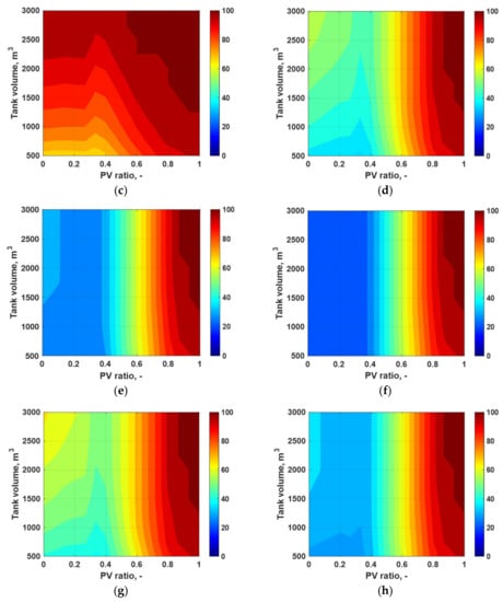 Another approach for the improvement of the supply system’s reliability is the use of diesel generators. This solution is in conflict with the green energy concept, but according to [], the solution with a diesel generator has advantages over batteries due to the security of supply and the lower cost. This allows the operation of high power systems, i.e., 140 kWp instead of 40 kWp. The PV system in the study is mounted on single-axis trackers, which increases the system’s energy yield to better follow the load profile of the irrigation of olives in Portugal. The results show good utilization of the PV energy. Different scenarios for irrigation are considered in [] among the other loads in a stand-alone micro grid in Bangladesh with PV and diesel generators. The daily irrigation scenario has an advantage because of the better use of the PV energy, the reduced emissions of gases with greenhouse effects and the decreased electricity cost.