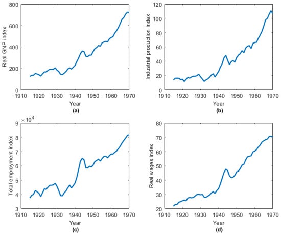 Macroeconomic indexes of the U.S. from 1915 to 1970: (a) real gross national product (); (b) industrial production index (); (c) total employment index (); (d) real wages ().