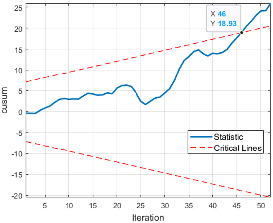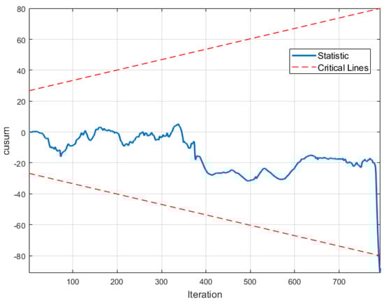 - If the sequence of the CUSUM test statistics crosses into the critical region after some recursive regression iterations, then it indicates the occurrence of a fault or an abnormal problem in the engineering system or structure at the current data sample. Consequently, send the warning information about the possible occurrence of a fault. After the fault/abnormality is identified, a waiting time period must be spent until a certain data sample when the system or structure completely returns to the normal operating state. Then the calculation procedure can start again from Step 1.