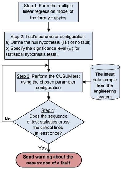 It is important to clarify here that this study does not simply apply the CUSUM test. The main idea of the proposed method is to perform the CUSUM test in the loop (as shown in Figure 3) at every acquired data samples (or observations) to assess the stability of the regression coefficients () in the multiple linear regression model using significance tests or statistical hypothesis tests. This is the key point to make the CUSUM test usable for on-line condition monitoring applications. It is assumed that if there is statistically significant evidence to reject the null hypothesis of coefficient stability at the chosen level of significance, then it implies that a fault or an abnormal problem might occur in the engineering system and/or structure of interest.