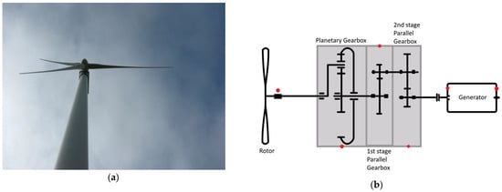 The wind turbine used in this study: (a) general view; (b) kinematic scheme with locations of vibration sensors (red dots).