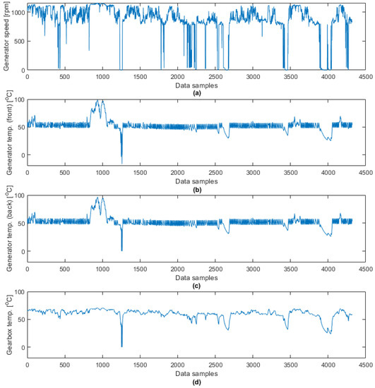 SCADA data set used in the case study: (a) generator speed; (b) generator bearing temperature (front); (c) generator bearing temperature (back); (d) gearbox bearing temperature.