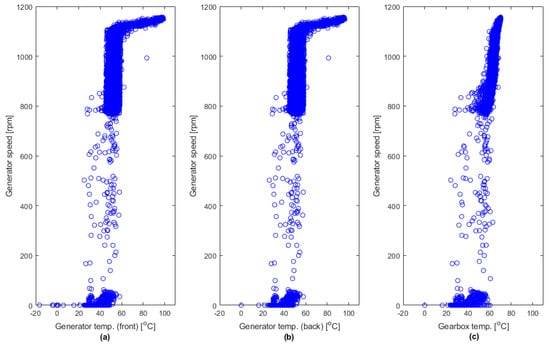 Nonlinear relationships between the generator speed and three temperature parameters: (a) generator temperature (front); (b) generator temperature (back); and (c) gearbox temperature.