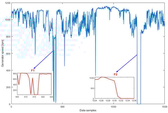 Generator speed data displaying the abnormal operating state (F1) and the gearbox fault (F2) occurred during monitoring process.