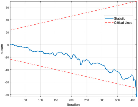 where is the intercept term, , , and are the slope coefficients, and is a Gaussian random variable with mean zero and standard deviation . The null hypothesis is defined as that the regression coefficients in the model given by Equation (6) are identical (or stable) across all sequential subsamples. If at least a value of the sequence of the CUSUM test statistics goes into the critical region (limited by the upper and lower critical lines), it suggests structural change in the model over time (i.e., the null hypothesis is rejected). If all values of the test statistics stay out of the critical region, it indicates failure to reject the null hypothesis, i.e., there is no structural break in the observed data, or in other words, the model is stable.