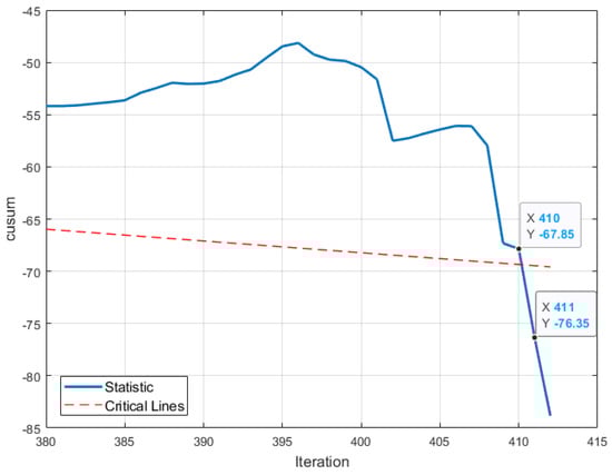 The monitoring and diagnosis results of the abnormal operating state F1 are shown in Figure 8, where the sequence of CUSUM test statistics is plotted together with two critical lines (specified by the dashed lines). In order to illustrate the detection process of F1 more clearly, the results in Figure 8 are enlarged in Figure 9 for the recursive regression iterations in the range (380, …, 415). It indicates that F1 could be detected between the iterations 410 and 411 when the sequence of CUSUM test statistics crosses the lower critical line. In other words, the abnormal operating state was detected by the calculation procedure at the data sample 411. As described in Section 4, the abnormal operating state F1 occurred during a 80-min time interval between the data samples 410 and 418. Due to the fact that this abnormal operating state could be detected at the data sample 411, it implies that the proposed method detected the abnormal operating state F1 at the very early stage of its occurrence.