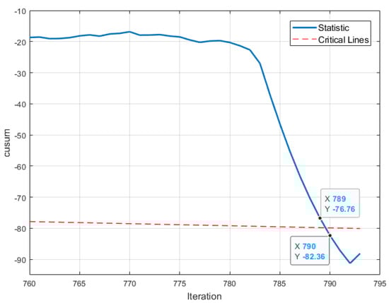 Figure 10 presents the monitoring and diagnosis results obtained for the gearbox fault F2. The fault detection process is simply based on the sequence of CUSUM test statistics plotted against two critical lines. Figure 11 enlarges the results for the recursive regression iterations in the range (760, …, 795). It shows that F2 could be detected between the iterations 789 and 790 when the sequence of CUSUM test statistics crosses the lower critical line. In other word, the gearbox fault was detected by the calculation procedure at the data sample 790. Moreover, since this detection is computed using data set from the sample 440, as discussed above; and for each iteration, a new data sample is added to the computation. Therefore the exact moment of detection is at the data sample 1230 (i.e., 440 plus 790). As described in Section 4, the gearbox fault F2 really came to effect at the data sample 1232 after the generator speed was dropped down to the zero value. Since this gearbox fault could be detected at the data sample 1230, it can be stated that the proposed method detected in advance (20 min earlier) the occurrence of the gearbox fault. This would provide operators sufficient time to shut down the WT in order to prevent the system from being damaged or destroyed.