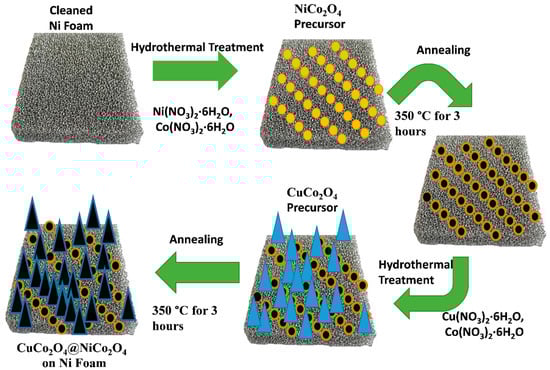 In 70 mL of deionized water, 0.058 M of Co(NO3)2·6H2O and 0.028 M of Cu(NO3)2·6H2O was added. Next, 0.33 M of NH4F with 0.51 of M of urea was added to the above solution, then it was put on a magnetic stirrer for half an hour to obtain a clear solution. Later, the solution was transferred to a 100-mL autoclave and clean nickel was suspended with the help of Teflon tape. The autoclave was sealed and kept for 6 h at 120 °C. With the completion of the reaction time, the autoclave was kept at room temperature to cool down. The nickel foam was separated from the reaction mixture and washed with ethanol and deionized water multiple times in order to remove the loosened impurities. The nickel foam was dried overnight at 80 °C and later annealed at 350 °C for 3 h. For the synthesis of CuCo2O4@NiCo2O4 on nickel foam, the whole process remained the same, except instead of clean foam, NiCo2O4-loaded nickel foam was used in the reaction mixture. The whole synthesis process is illustrated in Figure 1.