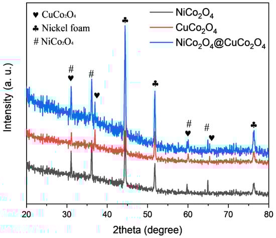 The crystallographic phase and the structure of the prepared materials loaded on nickel foam are displayed in Figure 2. The diffraction peaks that appeared at 2θ of 31.09°, 36.94°, 59.80°, and 65.38° are assigned indexes of 220, 311, 511, and 440, respectively, which is in accordance with the reported literature on CuCo2O4 (JCPDS 01-1155) [26]. The diffraction peaks for CuCo2O4@NiCo2O4 appeared at 2θ of 31.09°, 36.94°, 59.80°, and 65.38°, which matched well with the NiCo2O4 (JCPDS 73-1702) and CuCo2O4 (JCPDS 01-1155) [27]. As anticipated, the NiCo2O4 and CuCo2O4 showed similar XRD patterns, with a slight shift of 2θ, owing to their spinel structure and similar ionic radii of Ni and Co. In composite, XRD pattern slight distortion of peaks were seen but no broadening of peaks was observed, thus indicating an intact crystalline structure.